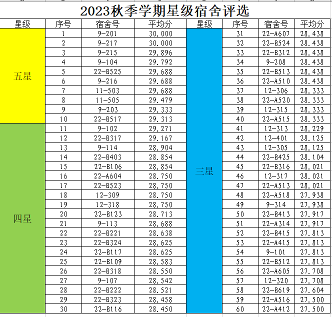 本次“星级宿舍”评比活动成员由院党总支副书记、各辅导员和院学生会宿管部组成,评比由院学生会宿管部对本学期各宿舍第一周至第十三周宿舍内务得分加权汇总,秉持“公平、公正、公开”的原则,从宿舍卫生、宿舍文化、宿舍内务等方面进行评选。在评比过程中,各宿舍积极参与,展现出干净整洁、空气清新、舒适温馨、宁静和谐的宿舍居住环境,展现了澳门网投官网学子严于律己的作风态度和对校园生活的热爱。最终评选出五星级宿舍10个、四星级宿舍20个、三星级宿舍30个,并对其予以奖励表彰。