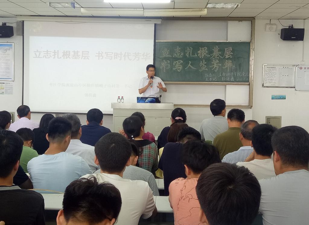 为鼓励青年大学生积极扎根基层,弘扬奉献精神,6月6日下午,澳门网投官方网站于理工楼2305教室召开“立志扎根基层·书写人生芳华”主题报告会。报告会由澳门网投官网派驻山亭区徐庄镇峨子山村第一书记、生命科学学院党总支书记郭传鑫主讲。机电学院全体师生党员、全院学生干部代表累计200余人参加了此次报告会。