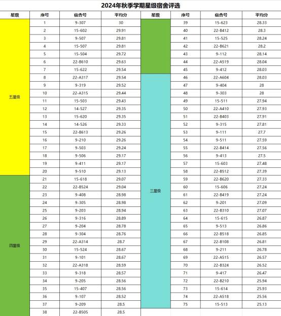 本次“星级宿舍”评比活动成员由院党总支副书记、各辅导员和院学生会宿管部组成,评比由院学生会宿管部对本学期各宿舍第一周至第十四周宿舍内务得分加权汇总,秉持“公平、公正、公开”的原则,从宿舍卫生、宿舍文化、宿舍纪律等方面进行评选。经过层层筛选和严格评比,一批优秀宿舍脱颖而出。这些宿舍不仅卫生状况良好,物品摆放整齐有序,而且展现出了独特的宿舍文化。在宿舍纪律方面,同学们严格遵守各项规定,按时作息,无违规现象发生。最终评选出五星级宿舍20个、四星级宿舍25个、三星级宿舍30个,并对其予以奖励表彰。