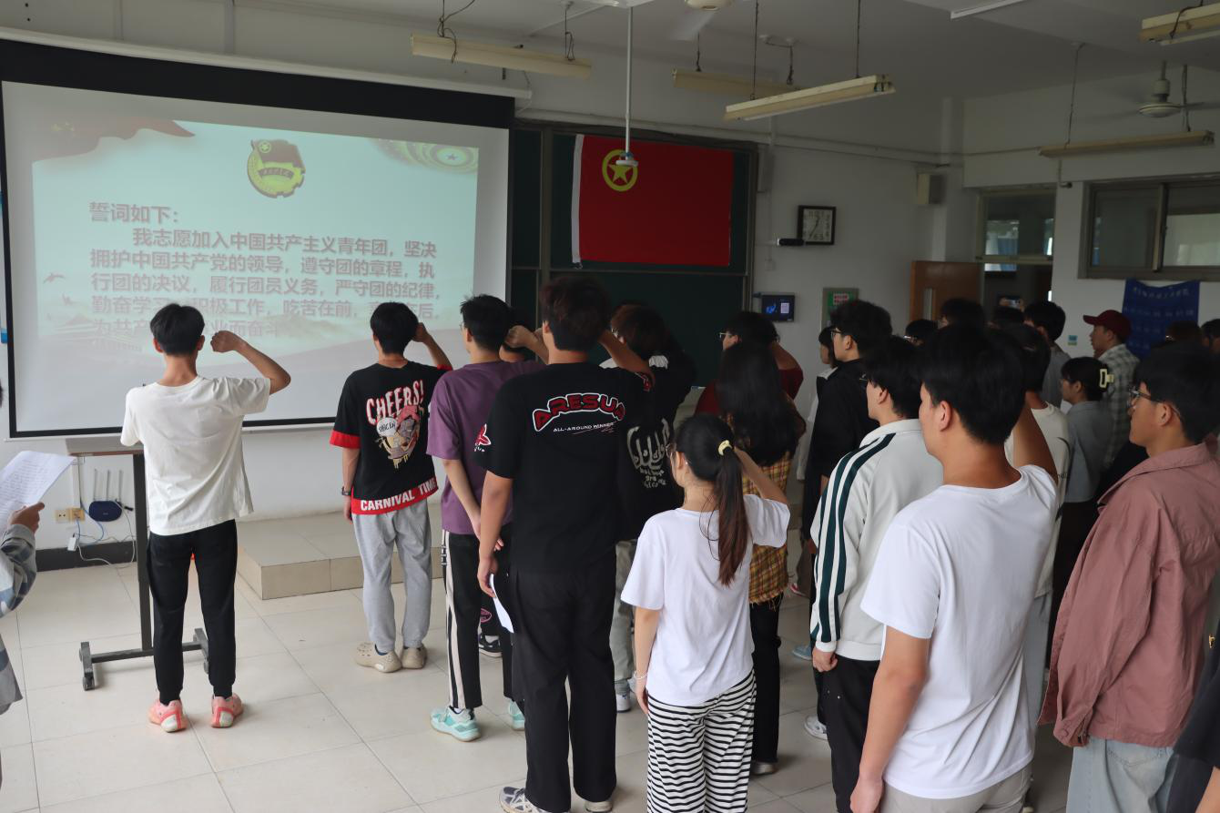 仪式开始,主持人现场宣读了新团员名单。老团员为新团员郑重佩戴团徽,新团员们面向团旗,在领誓人的带领下庄严宣誓:“我志愿加入中国共产主义青年团……”,表达他们对共青团的忠诚,对理想信念的坚守。随后新老团员依次上台发言,新团员表示将以更高的标准要求自己,努力学习。老团员表示勇担使命,珍惜荣誉。最后,仪式在《光荣啊,中国共青团》的歌声中圆满结束。