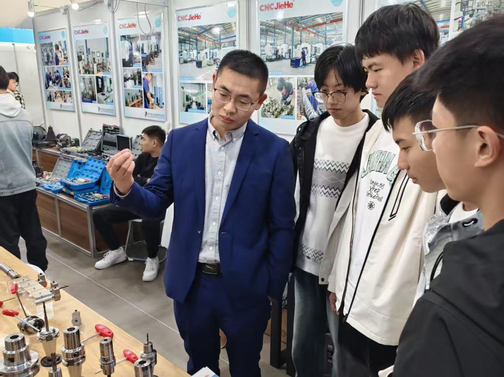 本届展会以“生态协同·智赢未来”为主题,由山东山森数控技术有限公司主办,滕州市机床产业发展中心等单位承办。在讲解员的引导下,同学们依次参观了生产车间、研发中心和智能制造展示区。在生产车间,整洁明亮的操作环境、精准运转的操作流程令同学们印象深刻,大家亲眼见证了机械零部件的制造与加工过程,感受了工业生产的严谨与高效。研发中心汇聚了来自全国各地的优质企业及其前沿应用,进一步拓宽了同学们对产业链全景和专业未来前景的认知。在智能制造展示区,种类繁多、加工精良的部件实物吸引了同学们驻足良久,大家近距离观察、询问,加深了对核心部件的直观认识。同学们不时驻足询问,在与参展技术人员的深入交流中缩短着理论与生产实际的距离,现场互动氛围融洽。