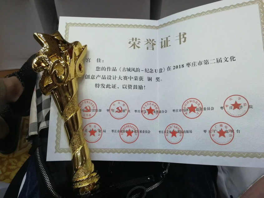 近日,在枣庄市举办的第二届文化创意产品设计大赛中,澳门网投官方网站2017级工业设计专业学生宫佳作品《古城风韵—纪念U盘》取得创意类铜奖,于10月27日在枣庄市台儿庄古城兰祺会馆举行颁奖典礼。